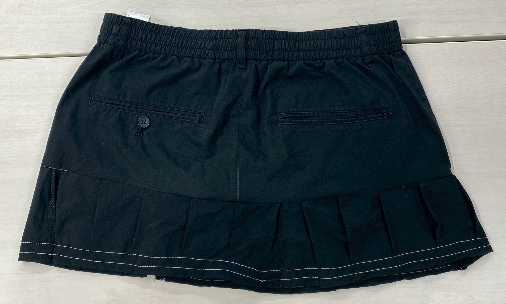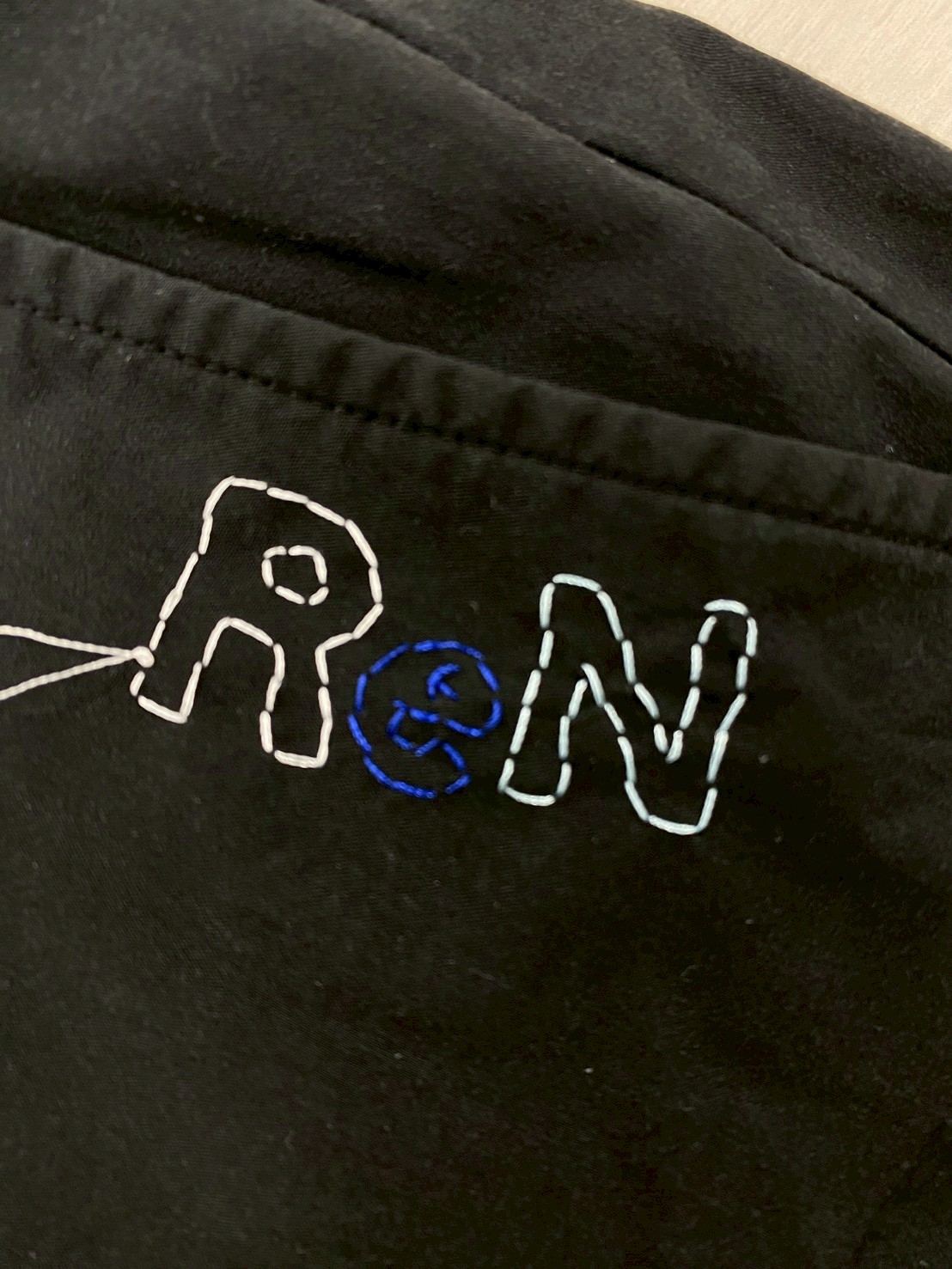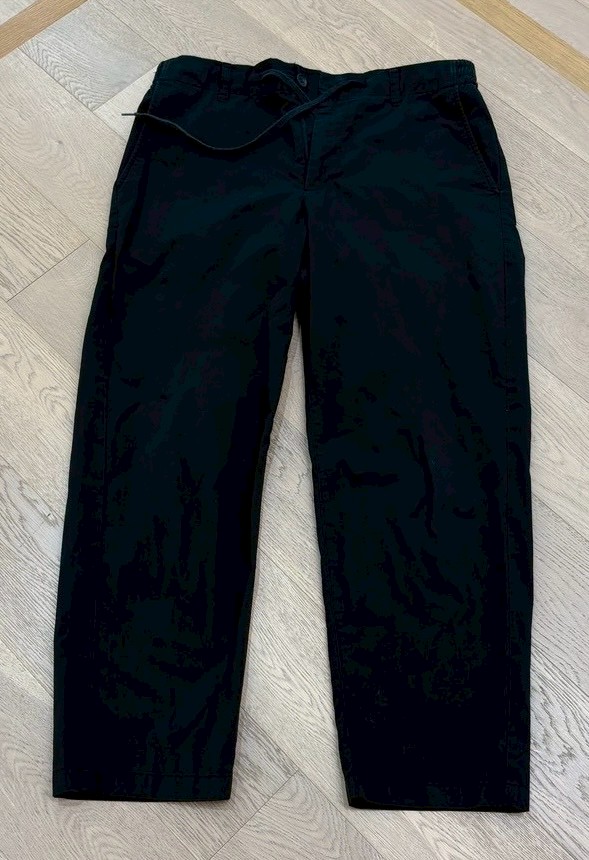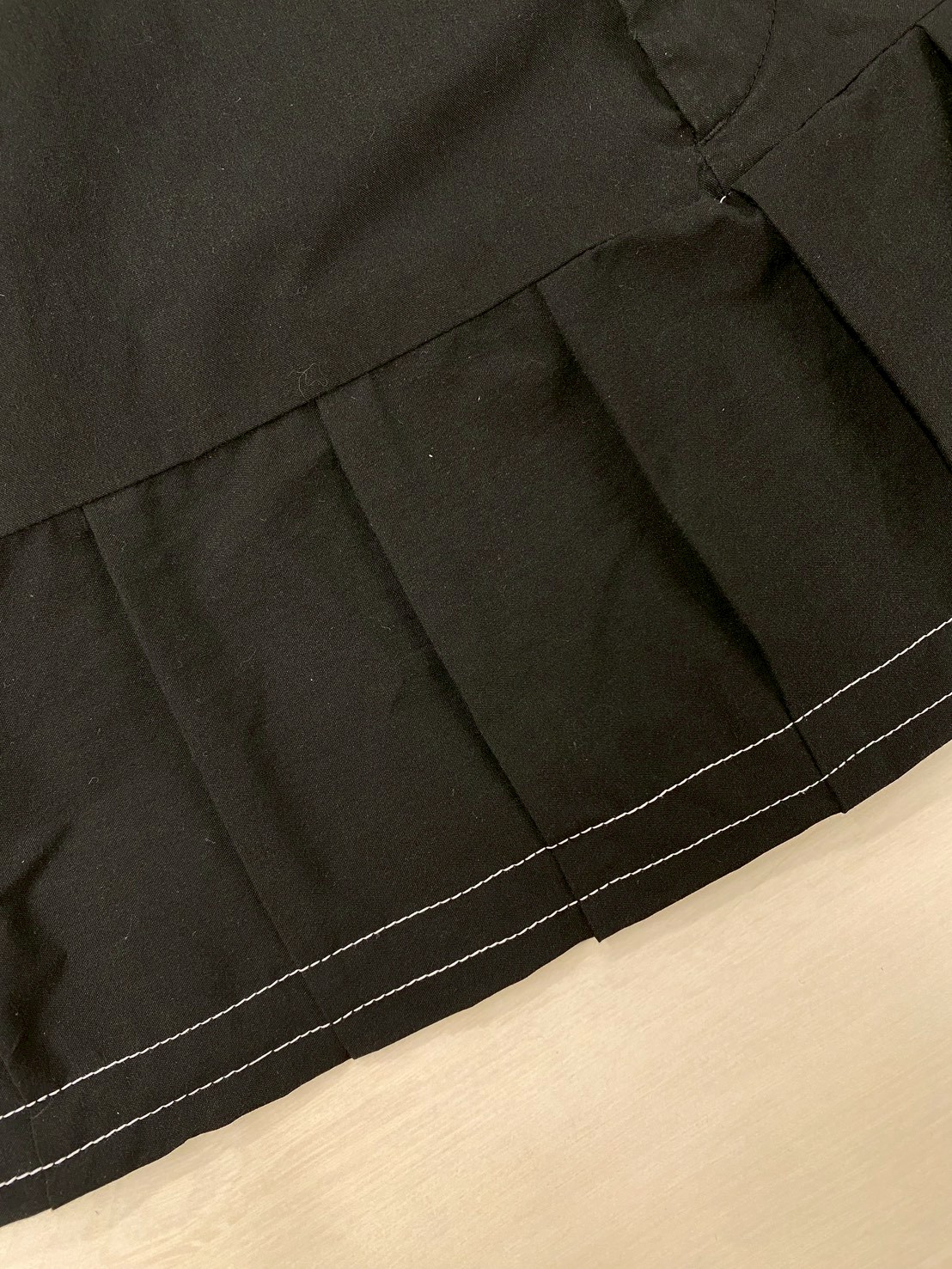 黒の長ズボンは、残りのプリーツを形成し、ブランド名を途中まで刺繍した。