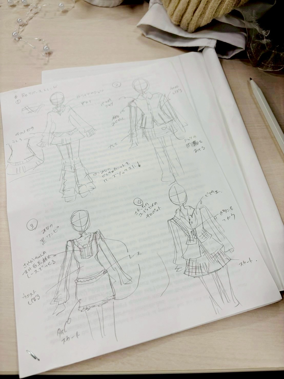 リメイク作業班は、1つのリメイク服を完成させるより、誰がいつ来てもすぐ作業に取り掛かれるように、補助線を引いたり、仮止めをしたりと、簡易的な作業を先に進める。