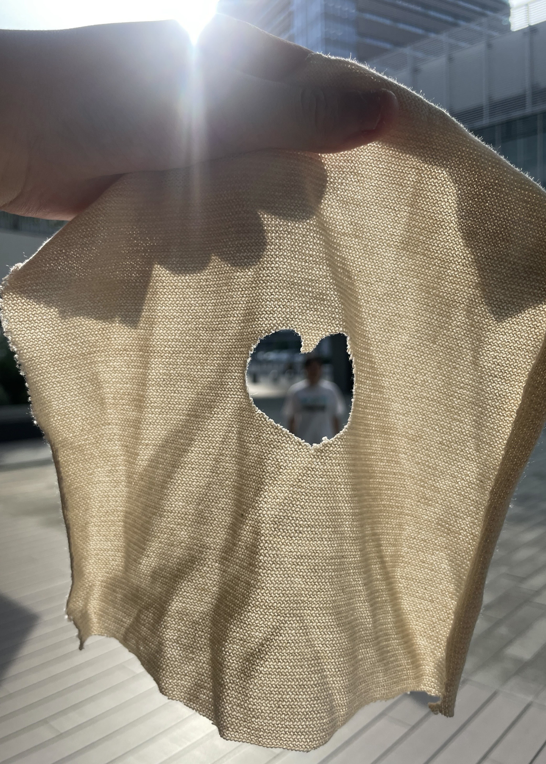 Dの布を四角形に切り取り、中央をハート型で切り抜いた。